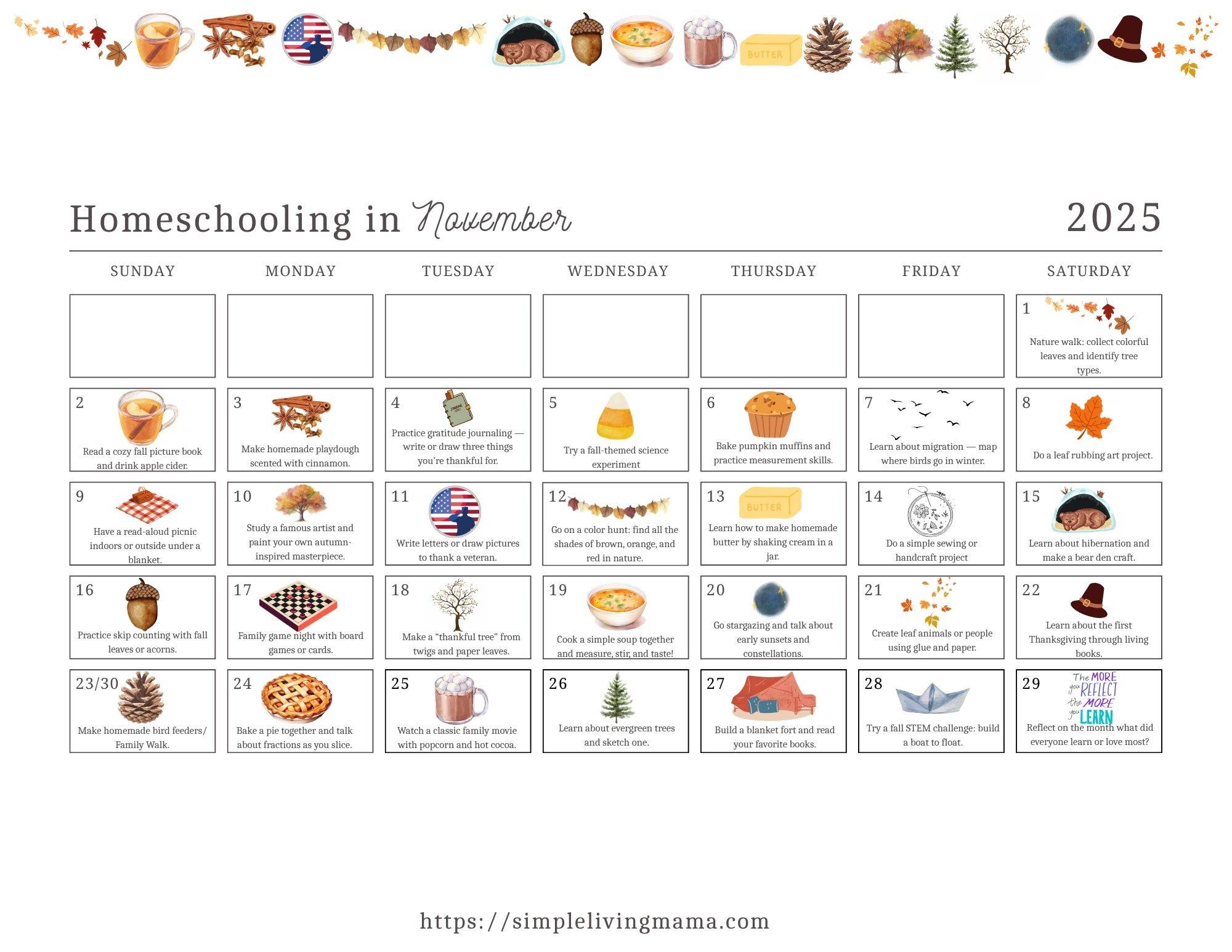November Homeschool Activities Calendar